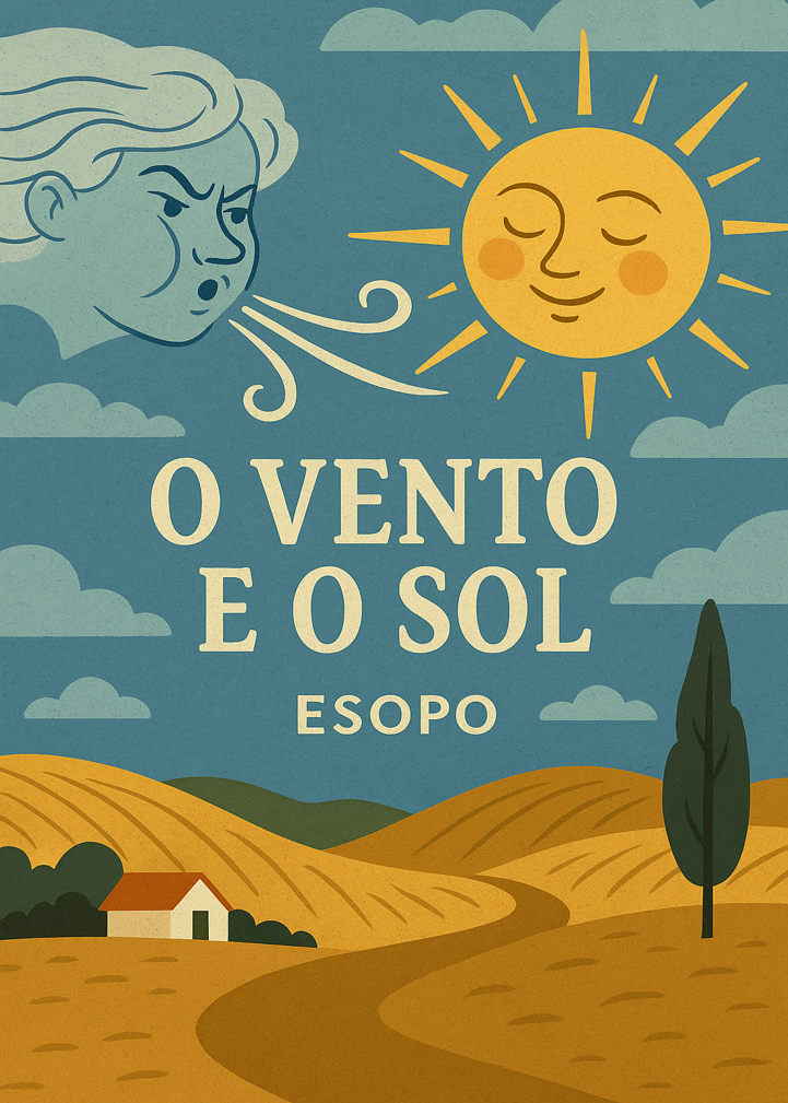 O vento e o sol disputam quem consegue tirar o manto de um viajante. Enquanto o vento falha com sua força, o sol triunfa com seu calor gentil. A fábula ensina que a suavidade e a gentileza são mais eficazes que a força bruta. Simples e universal, encanta leitores de todas as idades.